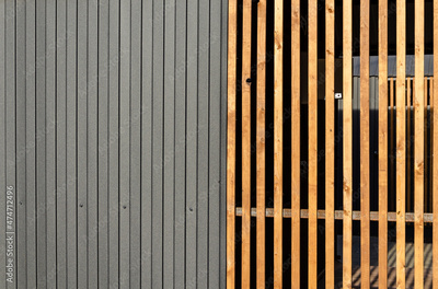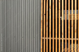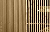 Kiosk pavilion made of vertical wooden slats.
