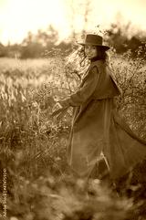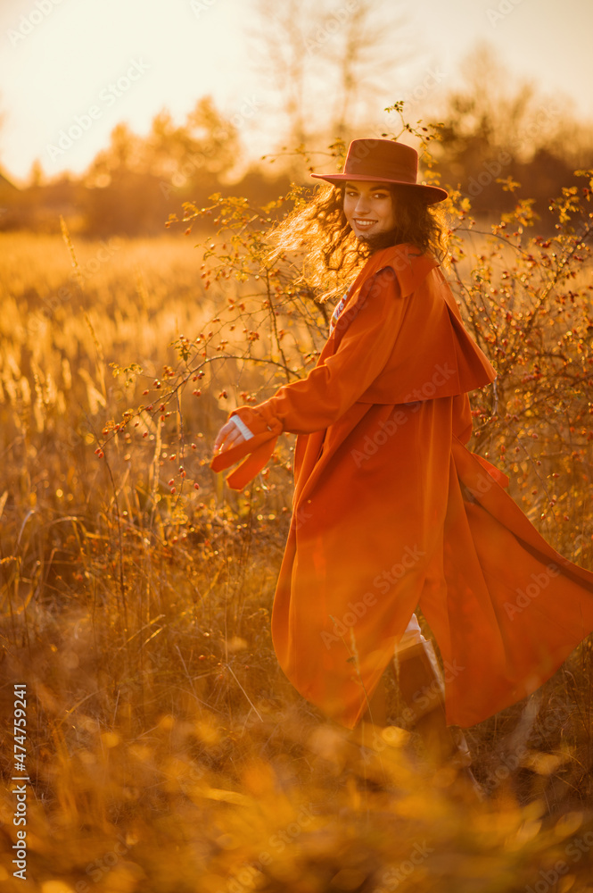 Happy smiling woman wearing trendy long orange trench coat, hat, posing in autumn nature during sunset. Full-length outdoor portrait