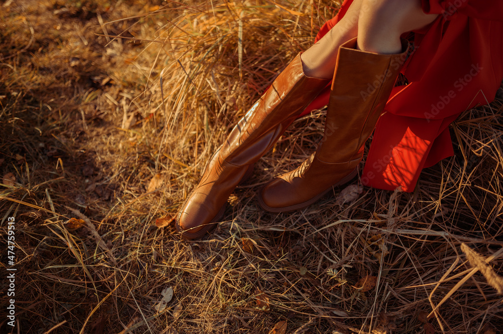 Trendy brown high knee riding style boots. Fashion details. Woman wearing stylish autumn outfit. Copy, empty space for text