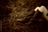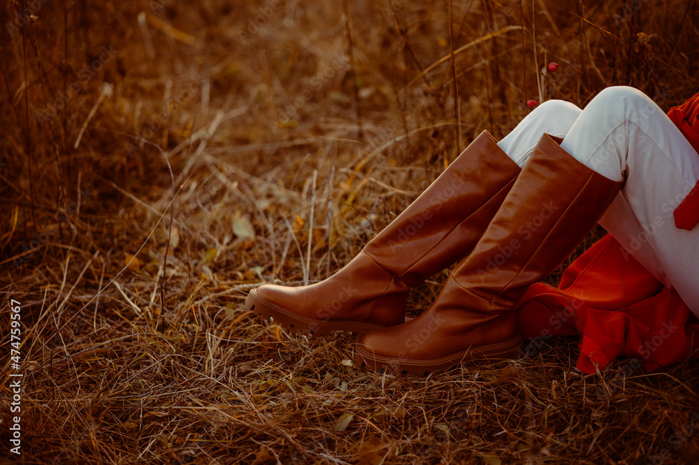 Autumn fashion outfit details: woman wearing trendy brown high knee riding style boots. Copy, empty space for text
