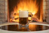 A glass of Beer with foam near cozy fireplace background.
