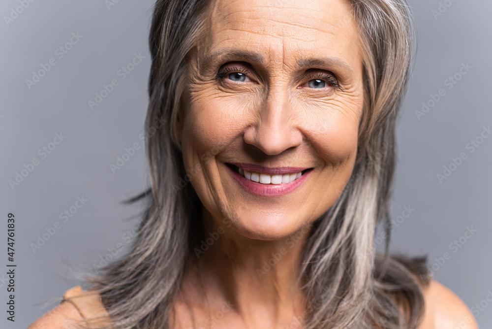 Wrinkled mature lady looking at the camera, close-up portrait of senior gray-haired charming lady with blue eyes, headshot of elderly beauty female. Anti-aging care concept