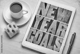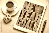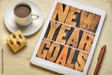 New Year goals banner - resolution concept - text in vintage letterpress wood type printing blocks on a digital tablet with coffee