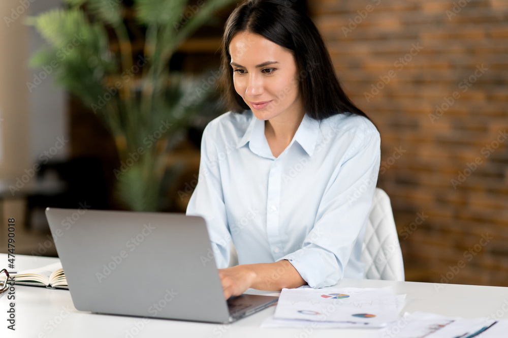 Cute successful smart joyful young caucasian business woman, office worker, brunette, sitting in office, in stylish formal clothes, using laptop, texting with colleagues, smiling