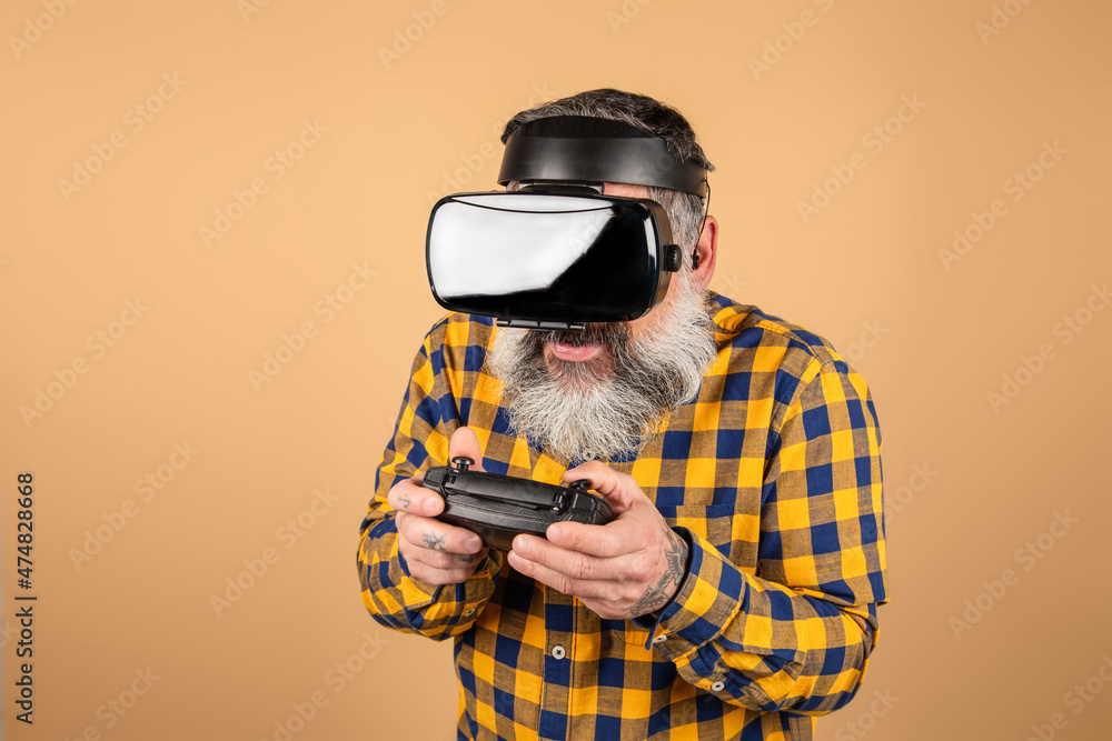 Bearded man playing video games on yellow background. Asian hipster man holding suit pad having fun, half-length shot.