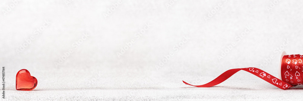 A roll of red gift ribbon with hearts for St Valentines day or 14 February. Glass heart. Minimal wide banner with copy space