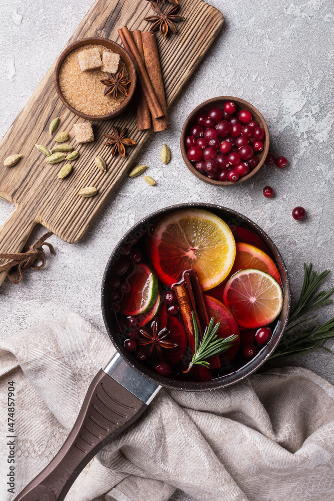 Mulled wine with slices of citrus fruits, berries and aromatic spices