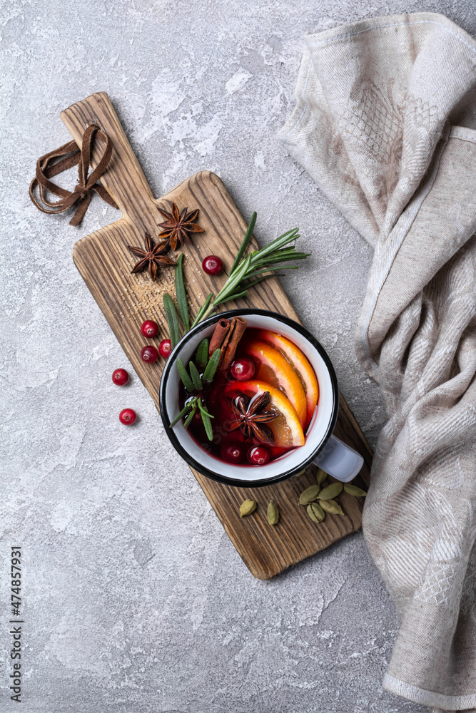 Mulled wine with slices of citrus fruits, berries and aromatic spices