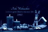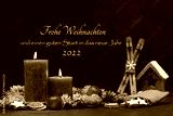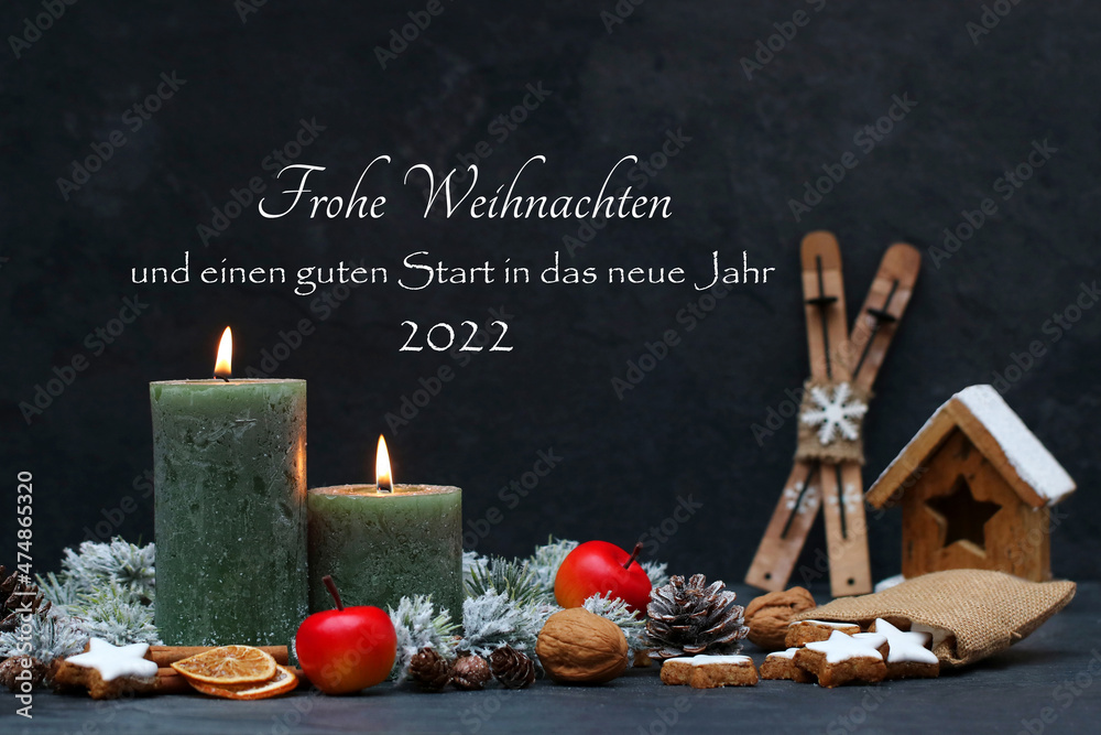Weihnachtskarte: Weihnachtsdekoration mit dem Text Frohe Weihnachten und einen guten Start in das neue Jahr 2022.