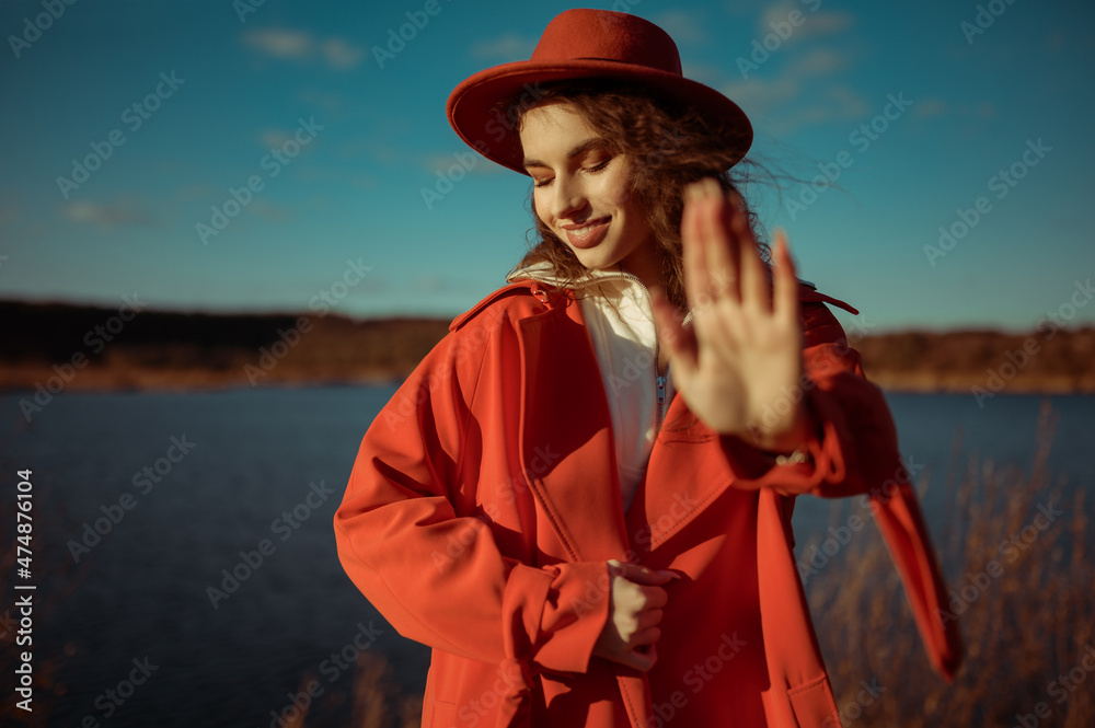 Happy smiling fashionable woman wearing trendy orange trench coat, hat, posing in nature. Outdoor autumn fashion, lifestyle portrait. Copy, empty space for text