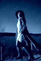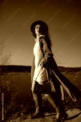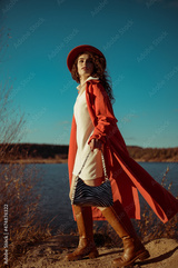 Outdoor full-length autumn fashion portrait of elegant woman wearing stylish white mini dress, orange trench coat, hat, brown leather high boots, holding zebra print bag, posing in nature.