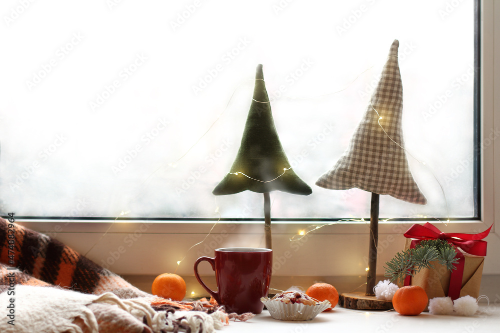 hot drink in a mug and berry cupcake on the windowsill with a plaid, tangerines, a gift, decorative Christmas trees on the background of the window. cozy winter Christmas morning
