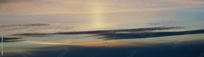 Pink orange yellow sunset. Beautiful evening sky with clouds. Skies background with copy space for design. Wide banner. Website header. Panoramic.