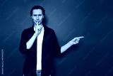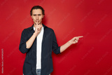serious man puts his finger to his lips and points towards empty space for advertising. studio portrait. dressed in casual clothes. isolated on red background. concept - taboo, secret sale, mystery