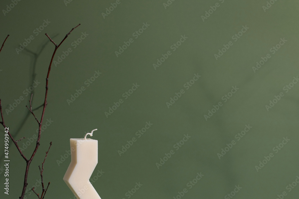 Zigzag shape soy candle on green background .Modern homemade candle, trendy hobby