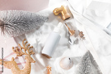 white snow background with lifestyle, cosmetic makeup bottle lotion cream product mockup with beauty fashion skincare for merry christmas festival gift