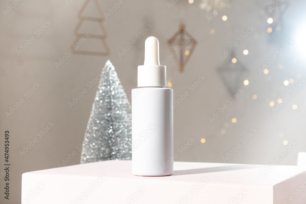 white snow background with lifestyle, cosmetic makeup bottle lotion cream product mockup with beauty fashion skincare for merry christmas festival gift