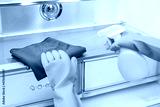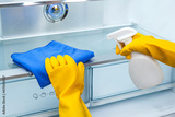 woman's hands in household gloves cleaning open empty refrigerator with glass cleaner and duster cloth.