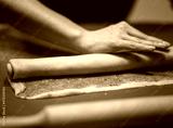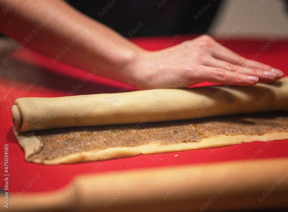 Hands are rolling out dough in flour with rolling pin