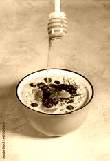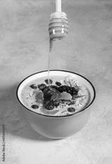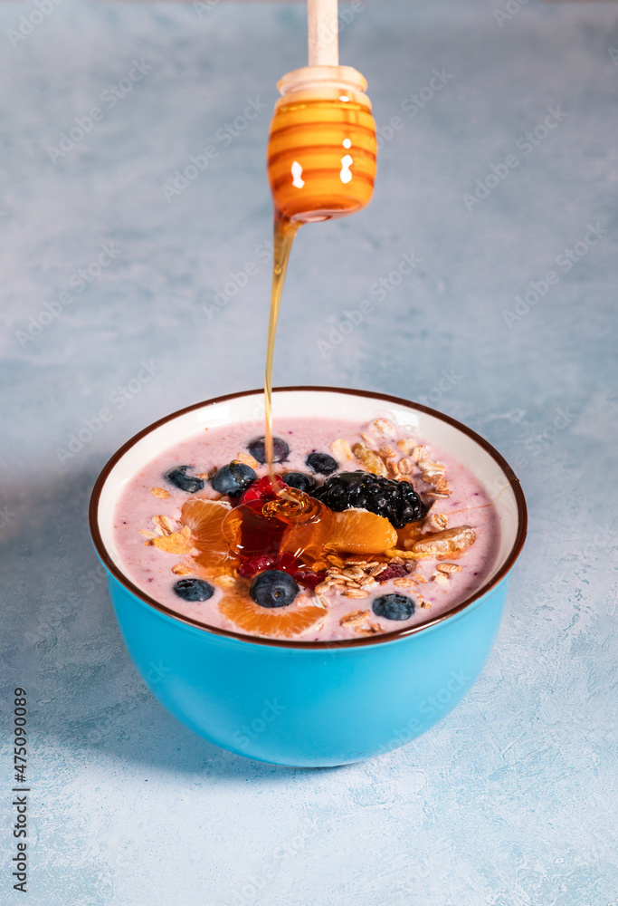 Pouring honey into a bowl with yogurt, berries and tangerine, vertical shot.