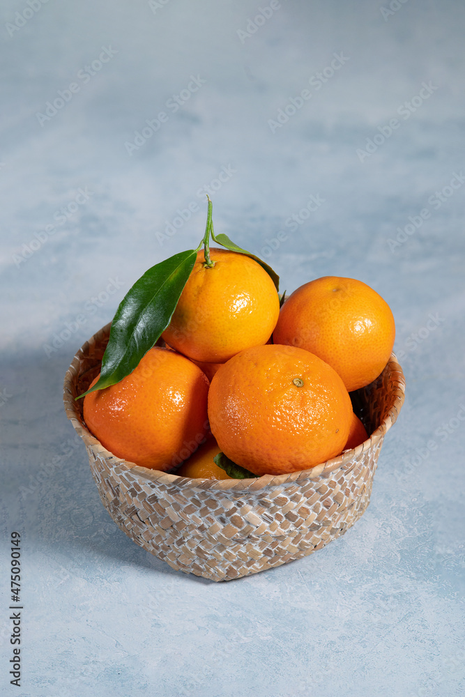 bowl of fresh tangerines on blue background, vertical shot