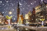 Beautiful Christmas tree in the old town of Gdansk at snowy night. Poland