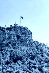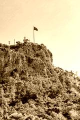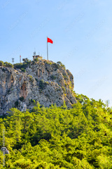 View on Chalish mountain and turkish flag on summit not far from the city Kemer. Antalya province, Turkey