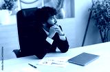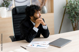 Successful attractive pensive Indian business leader, top manager or CEO in formal clothes with, sitting at a table in the office, resting from work, looking away, thinking about future business plans