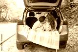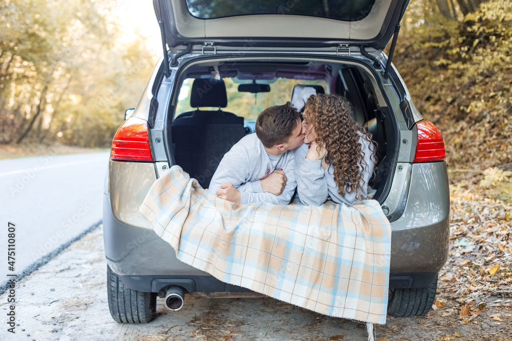 A man and a woman lie side by side and kiss. Picnic in the fall. Romantic date of lovers.