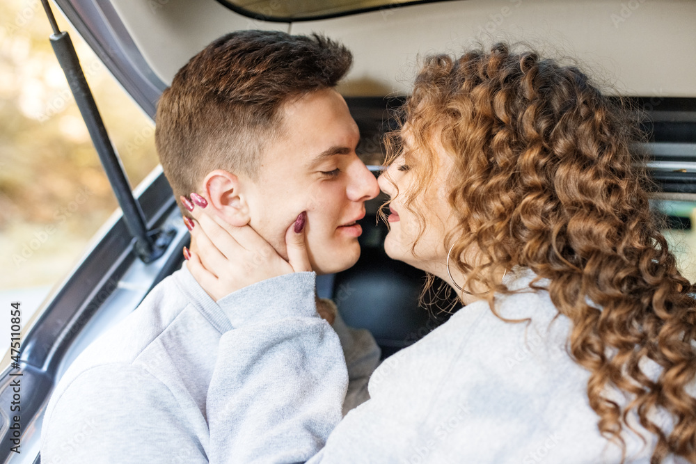 A man and a woman are kissing. Romantic date of lovers. Curly long hair.