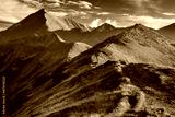 Beautiful autumn in the Western Tatras. Yellow and orange grasses create an amazing atmosphere. The light of the setting sun illuminates the mountain ridges.