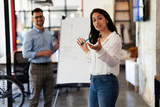 Businesswoman present her idea to working team. Young beautiful woman presenting businessplan..