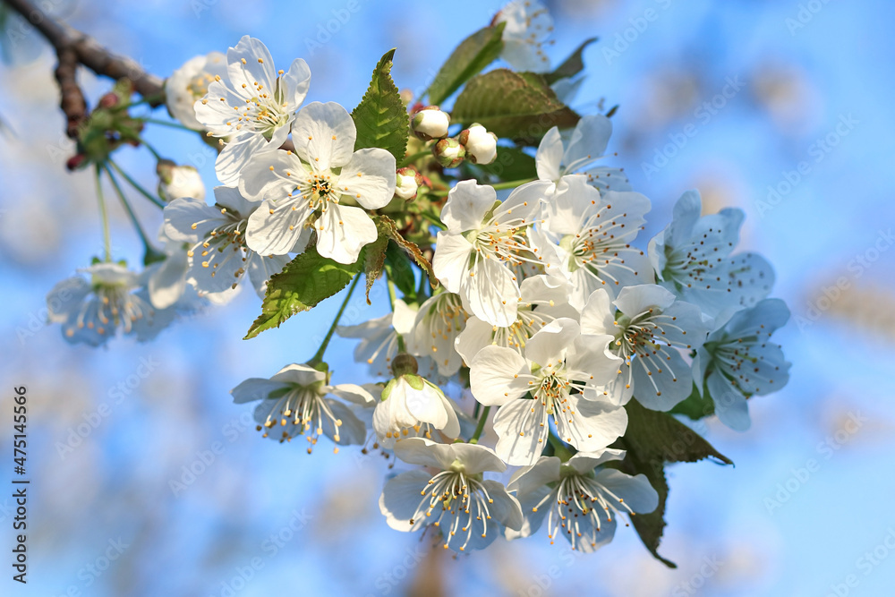 Close-up cherry blossom. Branches white flowers green leaves blue sky background close up. Beautiful cherry blossom. Spring orchard. Summer sunny day nature. Floral background.Сopy space