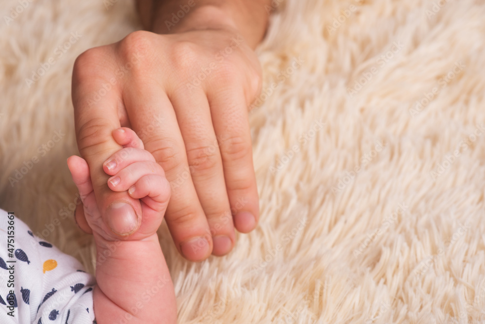 Dad holds in his hands a small baby hand. Small hand of a newborn baby in large hands of dad. Baby holds father's finger