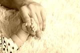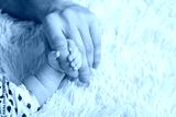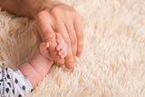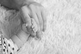Dad holds in his hands a small baby hand. Small hand of a newborn baby in large hands of dad. Baby holds father's finger