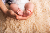 Dad holds in his hands a small baby foots. Small legs of a newborn baby in large hands of dad. Baby foot massage