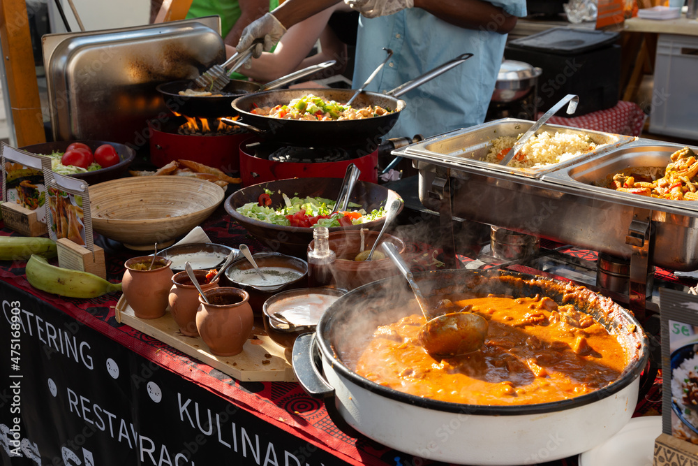 Cheff cooking fusion international cusine on street stall on international street food festival of Odprta kuhna, Open kitchen event, in Ljubljana, Slovenia