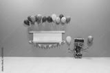 Happy birthday, Christmas, new year party or opening shop ceremony, event invitation, start of a project, business template. Toy robot with colourful balloons. Wooden sign decorated balloons, garland