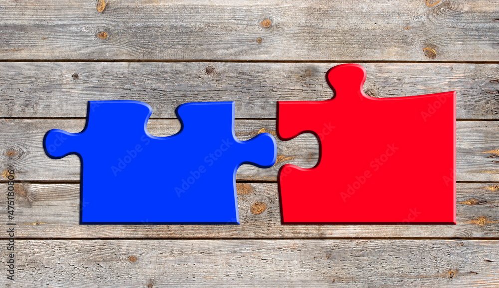 Zwei Puzzleteile, die ineinandergreifen auf einer Holzwand. 3D-Illustration