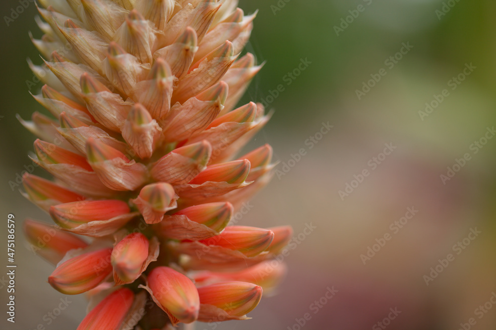 Aloe mutabilis bright inflorescence with orange, red, and yellow flowers, natural macro floral background
