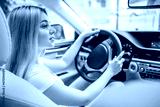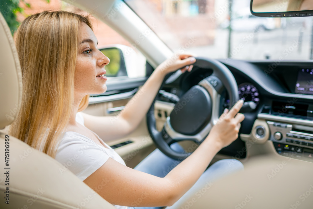 Close-up portrait of a pretty girl with a serious expression on her face, focused on the driver's seat, enjoying the music. People driving, transportation concept