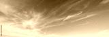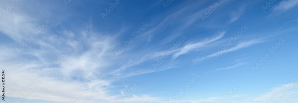 Ornamental clouds. Dramatic sky. Epic storm cloudscape. Soft sunlight. Panoramic image, texture, background, graphic resources, design, copy space. Meteorology, heaven, hope, peace concept