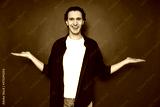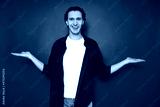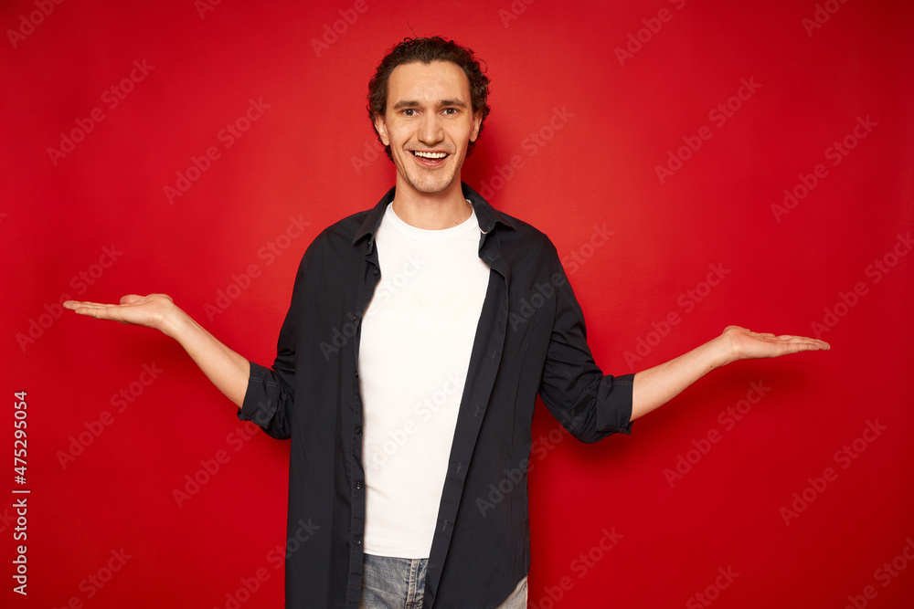 young man holds an empty free space with both hands, offers equal price options. smiling, dressed in casual clothes, isolated on a red background. concept - people, comparison, marketing, advertising
