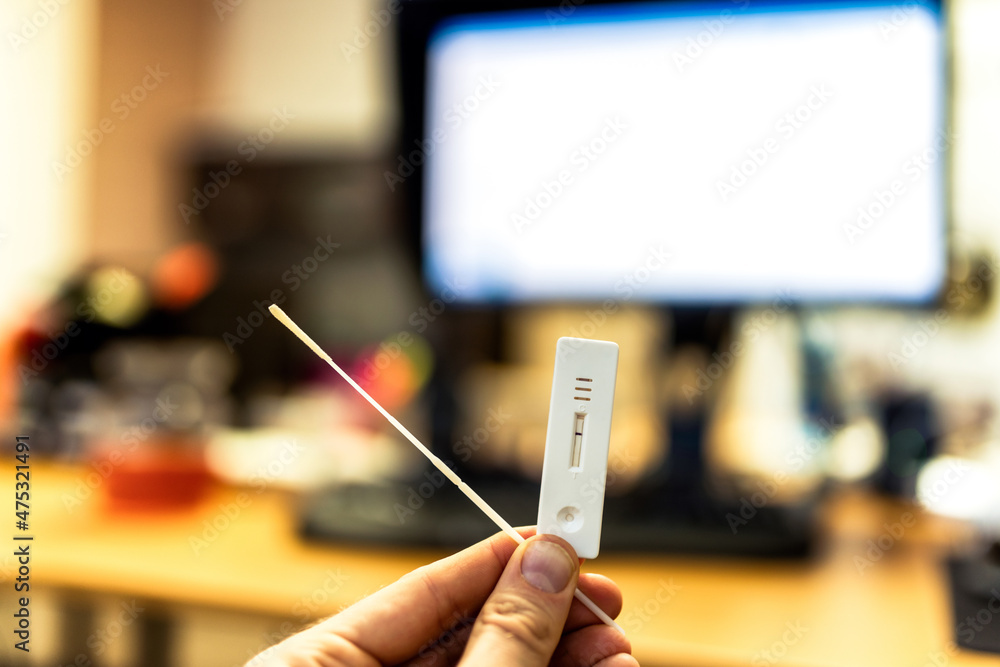 Covid-19 rapid antigen test with swab stick. Rapid antibodies test kit with negative result. Computer keyboard in office at background
