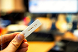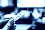 Covid-19 rapid antigen test. Rapid antibodies test kit with negative result. Computer keyboard in office at background