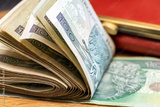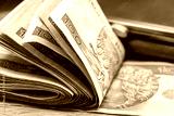 thick bundle of folded 100 zloty banknotes from Poland, table, wallet, close-up