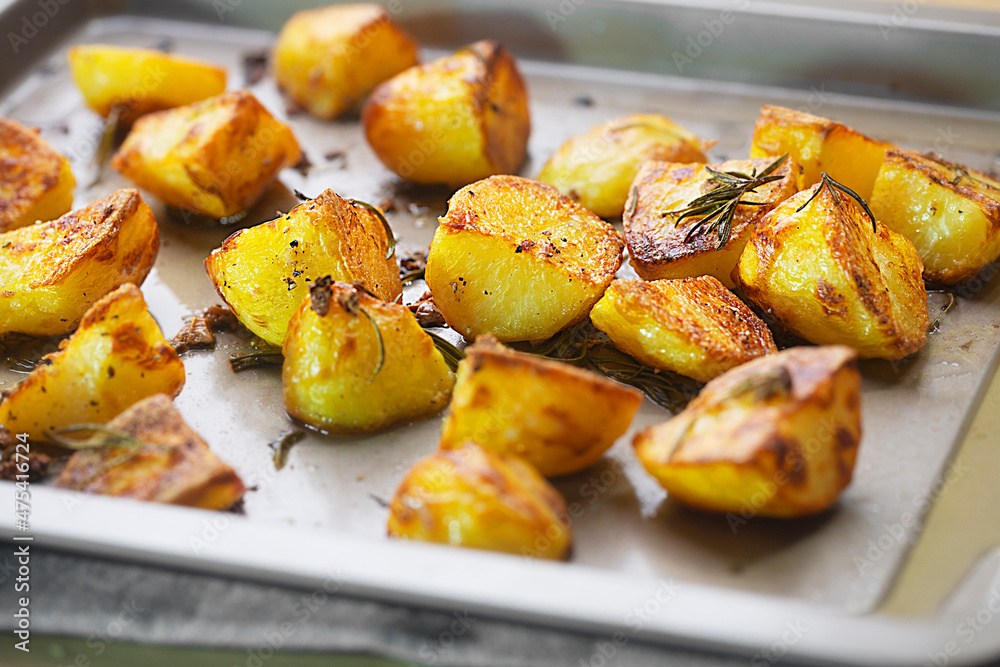 Roasted potatoes on the baking sheet with garlic and rosemary