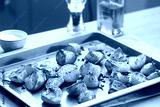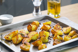 Roasted potatoes on the baking sheet with garlic and rosemary on the kitchen table