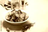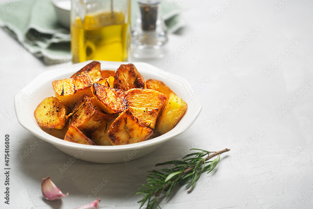 Roasted potatoes in the white plate with garlic and rosemary with copy sapce