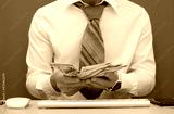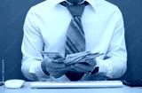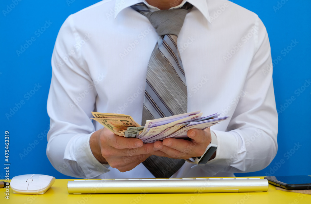 Businessman holding banknote and business or finance saving money, bank note with the concept of money on a blue background represents finance and banking.